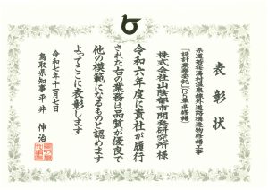 令和7年11月7日、鳥取県庁で表彰式が行われ、知事表彰を受けました。